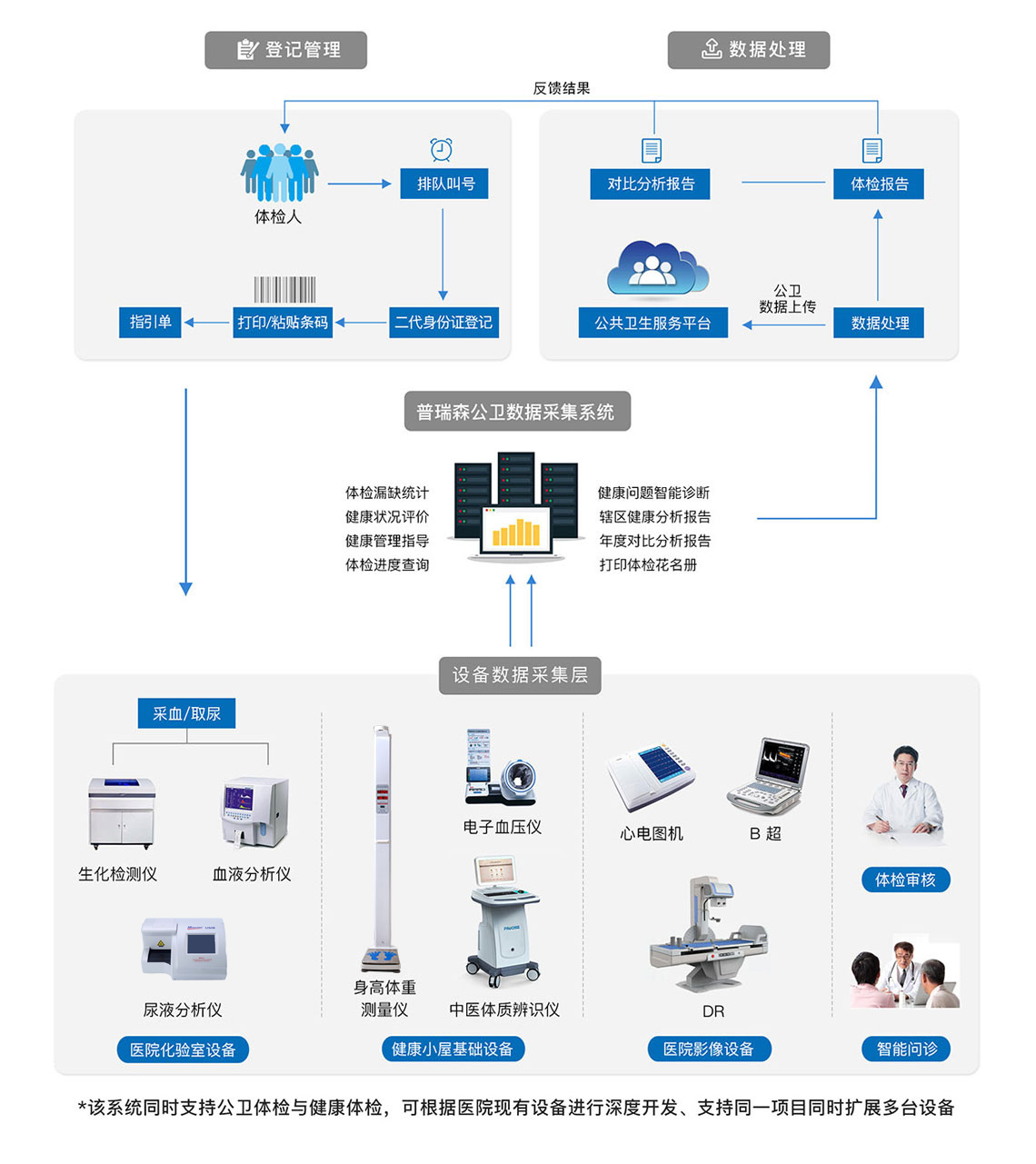 普瑞森公共衛(wèi)生數(shù)據(jù)智能采集系統(tǒng)院內(nèi)專業(yè)體檢方案,是在基層醫(yī)療機構(gòu)搭建一套適用于公衛(wèi)體檢、健康體檢、健康教育、健康管理為一體的健康管理中心,深度集成公共衛(wèi)生體檢基礎(chǔ)設(shè)備,無縫鏈接醫(yī)療機構(gòu)現(xiàn)有的心電設(shè)備、超聲檢查設(shè)備、化驗室設(shè)備,結(jié)合內(nèi)科、外科、中醫(yī)科等科室專業(yè)問診,實現(xiàn)居民快速建檔,體檢數(shù)據(jù)自動采集,體檢報告自助打印、體檢數(shù)據(jù)自動上傳至當(dāng)?shù)鼗竟残l(wèi)生服務(wù)平臺的全功能應(yīng)用。