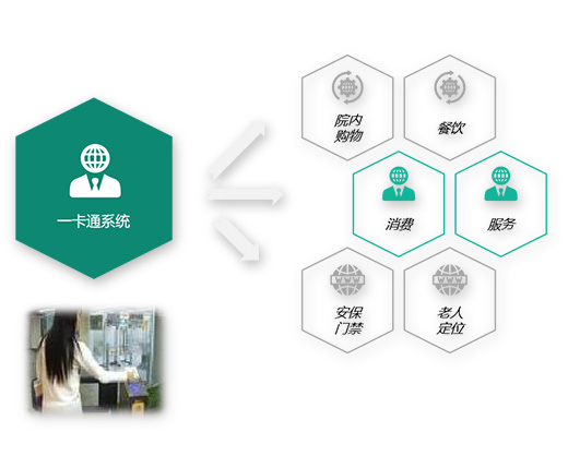 能在解決養(yǎng)老機(jī)構(gòu)的管理的繁瑣及復(fù)雜,將安保門禁、老人定位、購物、餐飲、服務(wù)、消費(fèi)集合于一體,實(shí)現(xiàn)一卡通的管理模式,一張老人卡記錄老人的行動軌跡及所有的消費(fèi)明細(xì)
